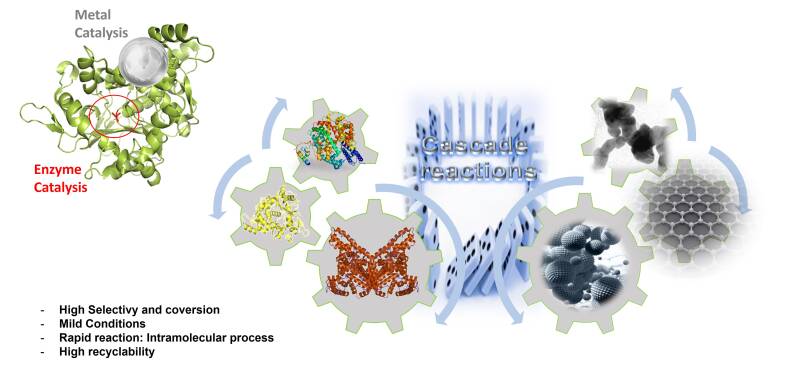 -Combining enzymatic and metallic active sites: enzyme-metal, enzyme-metal-metal, enzyme-enzyme-metal, etc.