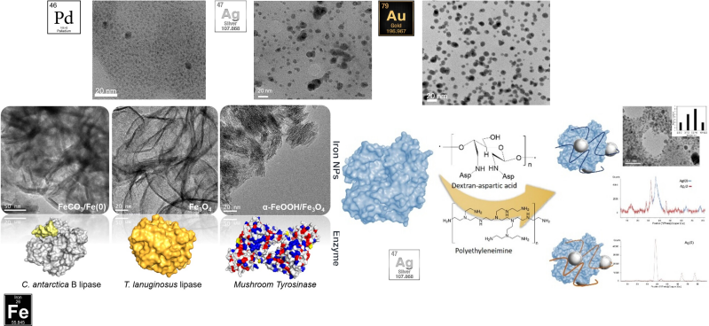 Some examples of nanobiohybrids of different metals with one enzyme and iron hybrids with different enzymes or the use of chemical modified enzymes as scaffold.
